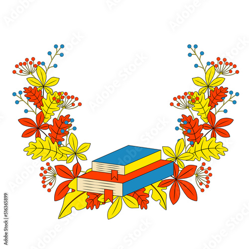 Концепция образования. Школьное образование. Осенний вектор. Многослойная иллюстрация, вырезанная из бумаги, с учебными принадлежностями и рисунком осенних листьев. Рекламная кампания, празднование Дня знаний. Обратно в школу
