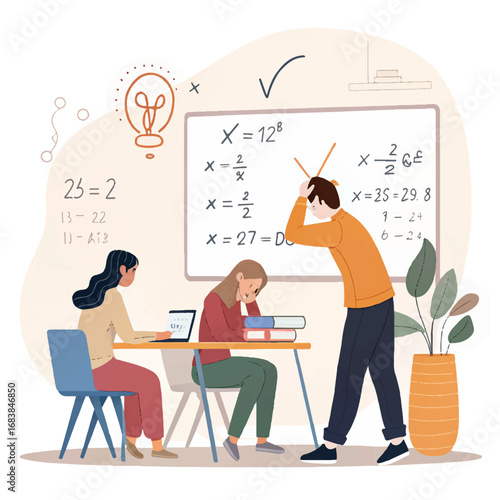 Огромный учебник физики и микросимволы в классе, векторная иллюстрация. Учитель указывает на книгу, ученики сидят за партами и пользуются планшетами. Цифровая школа, онлайн-обучение, дистанционное образование.