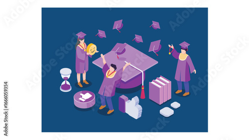 Шаблон образовательного векторного веб-сайта, дизайн веб-страницы и целевой страницы для разработки веб-сайтов и мобильных сайтов. Концепция онлайн-образования с выпускной шляпой, люди, использующие ноутбуки, держащие диплом и т.д.