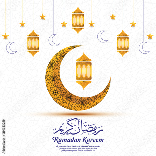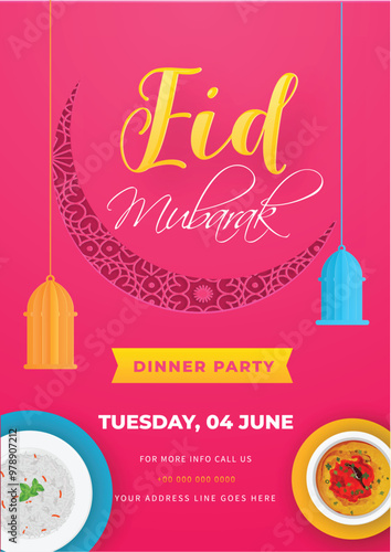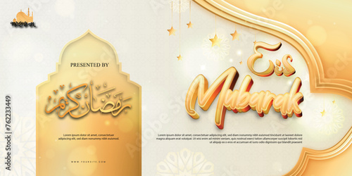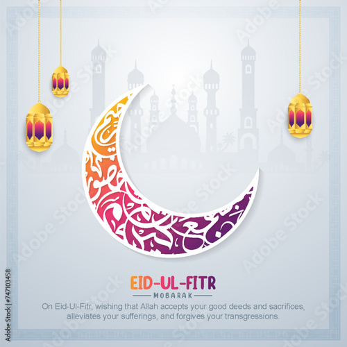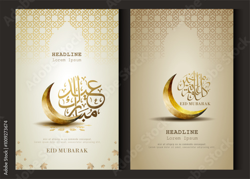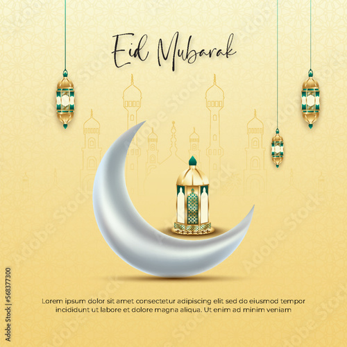 Дизайн открыток Ид аль-Адха выполнен в современном векторном стиле 3d. Баннер исламского праздника Ид Мубарак с фонарем Рамадана и луной. Мусульманское оформление и фон в Рамадан. Счастливого празднования Курбан-Байрама
