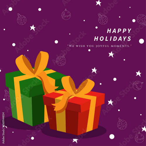 Дизайн открыток Ид аль-Адха выполнен в современном векторном стиле 3d. Мусульманское украшение Рамадана с подарочными коробками и фоном фиолетового цвета.