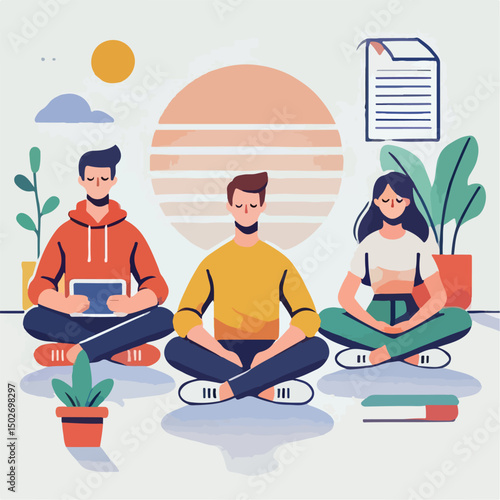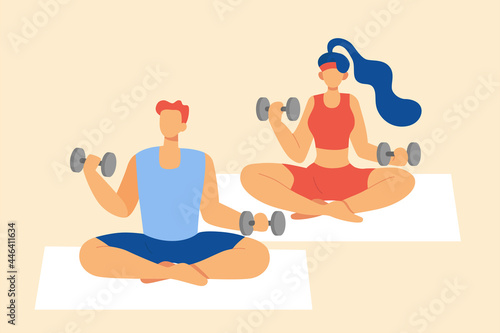 Пожилая пара медитирует и занимается йогой дома, плоская векторная иллюстрация. Спорт, фитнес-упражнения для пожилых людей. Активный здоровый образ жизни, домашний досуг.