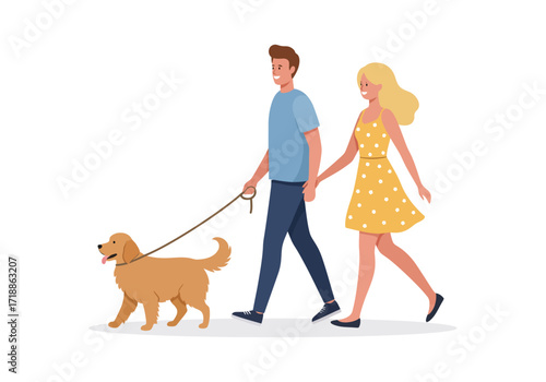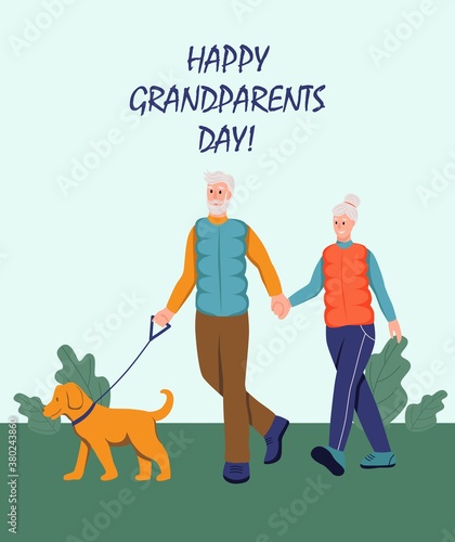Счастливая пожилая пара, гуляющая с любимой собакой, плоская векторная иллюстрация. Пожилые люди ведут активный образ жизни, проводят досуг на свежем воздухе.