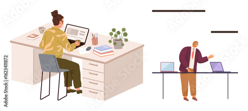 Пожилая пара смотрит телевизор дома, сидя в креслах, плоская векторная иллюстрация. Пожилые люди занимаются любимыми делами - вязанием, чтением. Образ жизни пожилых людей, домашний досуг.