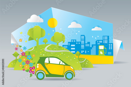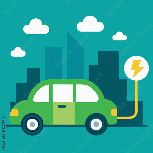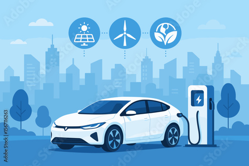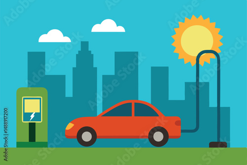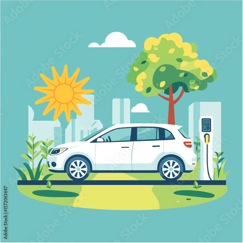 Зарядка электромобиля на зарядной станции. Векторная иллюстрация в плоском стиле. Предпосылки концепции экологического транспорта.