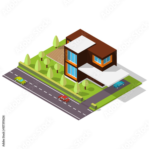 Электрическое зарядное устройство от солнечной энергии для дома и автомобиля в изометрическом векторе. Семейный дом с фотоэлектрической панелью на крыше и зарядкой электромобиля от альтернативного зеленого генератора