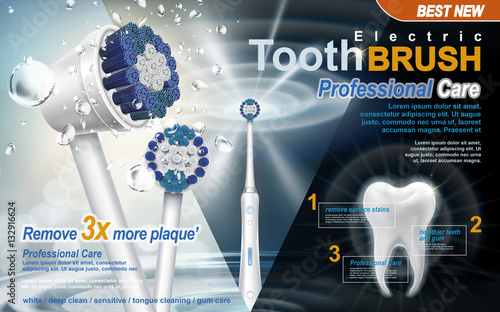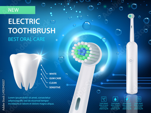 Векторная реалистичная иллюстрация электрической зубной щетки. Рекламный плакат новой электрической зубной щетки "Лучший уход за полостью рта".