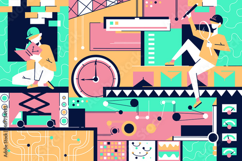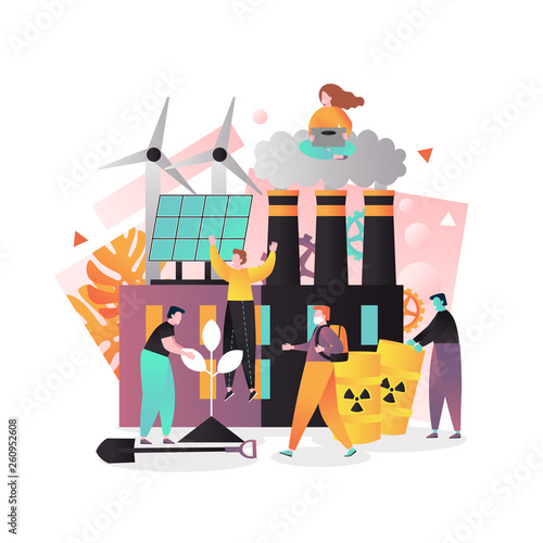 Векторная иллюстрация ветряных турбин, солнечных панелей, атомной электростанции с дымящимися трубами, люди, выращивающие дерево, в маске. Концепция зеленой энергии и источников загрязнения природы для веб-страницы с баннером.