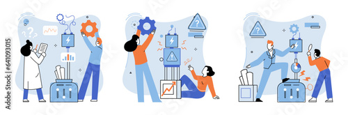 Предупреждающий знак об огромной опасности электричества и микроэлектрики с вольтметром электрооборудования, набором инструментов и лампочкой, векторная иллюстрация. Услуги по монтажу, ремонту и техническому обслуживанию электросетей.
