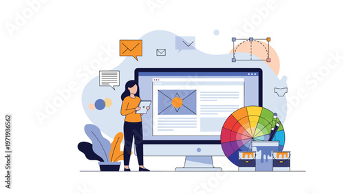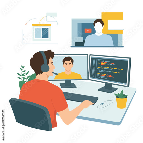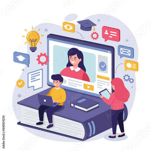 Магазин электроники, плоская векторная иллюстрация. Бытовая техника, аудиотехника, компьютеры, смартфоны на полках, продавец и покупатель - мультяшные персонажи.