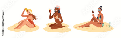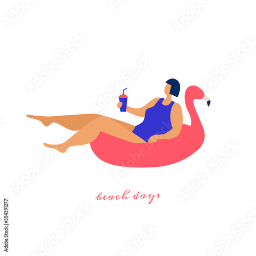 Элегантная счастливая женщина в купальнике и шляпе пьет алкогольный коктейль возле векторной иконки бассейна, изолированной на белом фоне.