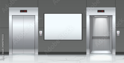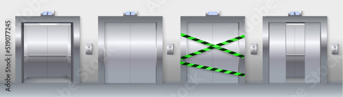 Реалистичный векторный набор лифта или подъемной двери. Элемент дизайна интерьера прихожей, вестибюля. Закрытый металлический пустой въезд, ворота с барьерной лентой для запрещенного въезда иллюстрация