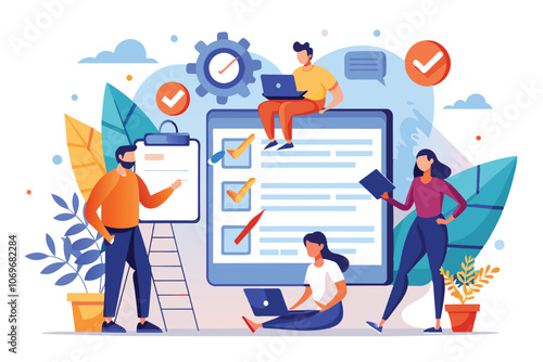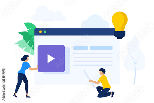 Векторная плоская иллюстрация большого монитора компьютера с письмом в открытом конверте, значком прочитанного сообщения, крошечными людьми, отправляющими и получающими электронную почту. Онлайн-коммуникация, концепция маркетинга по электронной почте.