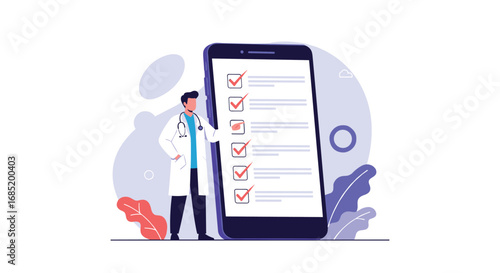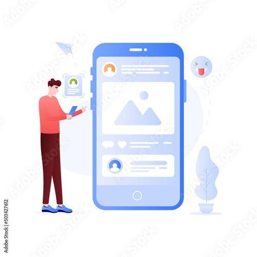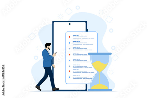 Векторная плоская иллюстрация большого смартфона с письмом в открытом конверте, значком прочитанного сообщения, крошечными людьми, отправляющими и получающими электронную почту. Рассылка и подписка по электронной почте, маркетинг по электронной почте.