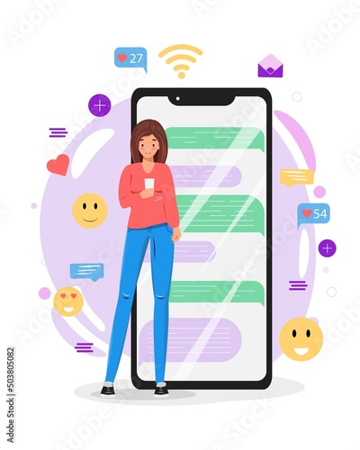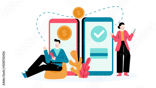 Стратегия мобильного маркетинга по электронной почте, векторная иллюстрация. Огромный смартфон и счастливые микро-персонажи мужского и женского пола, летящие на бумажном самолете, держа в руках круглые диаграммы.