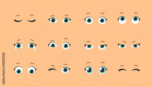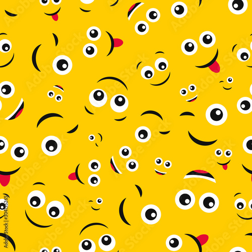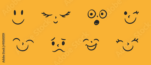 Набор мультяшных персонажей Emoji, векторная иллюстрация. Комический смайлик с грустным, счастливым, сумасшедшим, испуганным, скучающим выражением лица. Забавная улыбка, милые эмодзи-персонажи, выражающие разные чувства и эмоции.