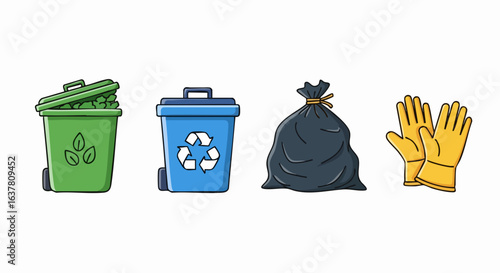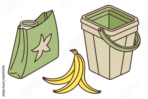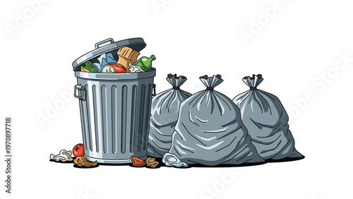 Пустое мусорное ведро или кухонный контейнер для мусора и полные пластиковые мешки для мусора, векторная иллюстрация. Пищевой мусор, органические отходы.