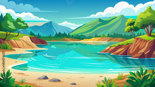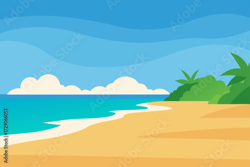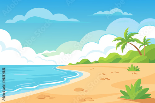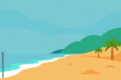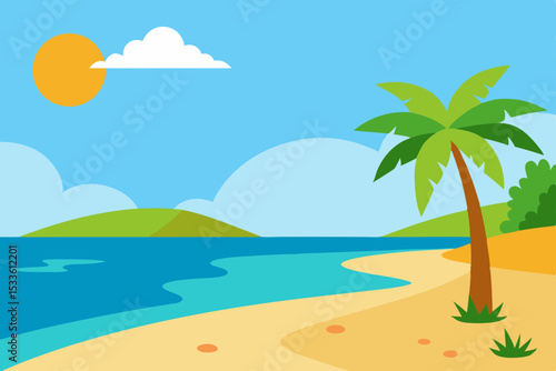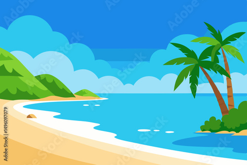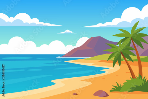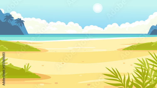 Пустой тропический пляж на курорте векторная иллюстрация. Побережье залива с теплой водой, песком, пальмами и горным утесом в солнечный день