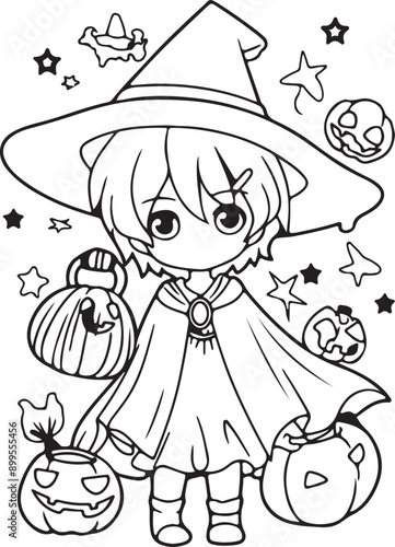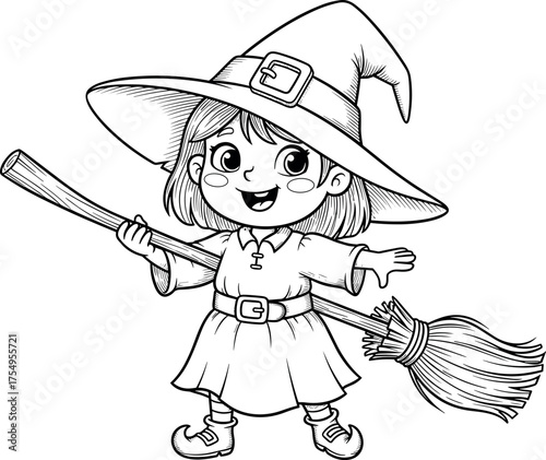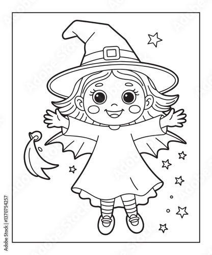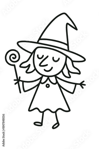 Вектор чародейки. Мультяшный персонаж в красивой шляпе, иллюстрация костюма. Изолированная девушка-фантазерка с волшебной палочкой. Волшебная волшебница из сказки. Ребенок в платье на Хэллоуин на белом фоне