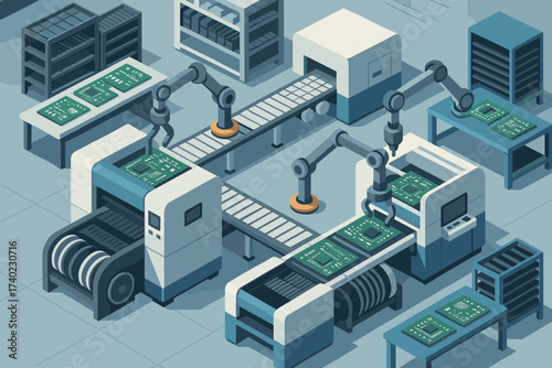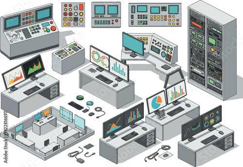 Инженеры устанавливают серверы в центре обработки данных, плоская векторная изометрическая иллюстрация. Настройка сетевого сервера, установка и конфигурирование аппаратного обеспечения, программного обеспечения.
