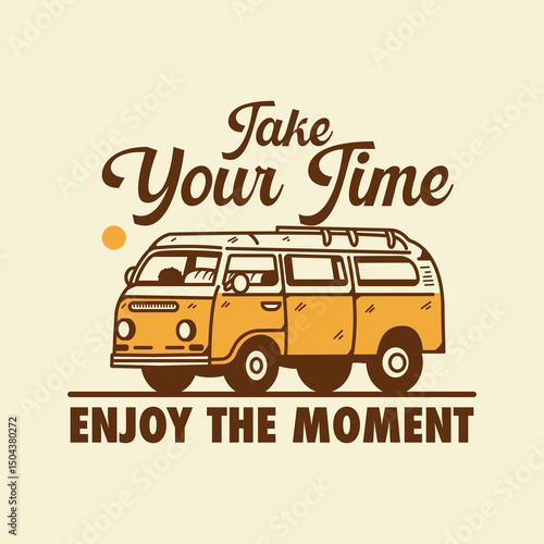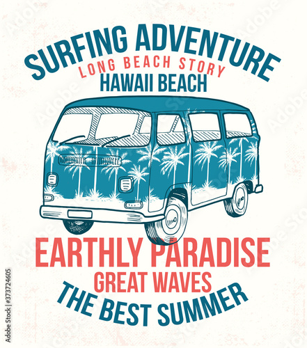 Наслаждайтесь летними каникулами, шаблоном дизайна плаката в стиле гранж-типографии, векторной иллюстрацией в стиле ретро. Концепция тура на микроавтобусе, мини-автобусе для баннера, листовки.
