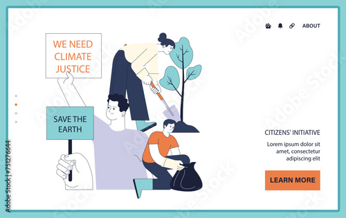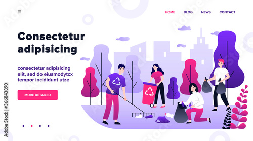 Векторный шаблон веб-сайта по охране окружающей среды, дизайн веб-страницы и целевой страницы для разработки веб-сайтов и мобильных сайтов. Концепция охраны природы с людьми, выращивающими растения, собирающими мусор.