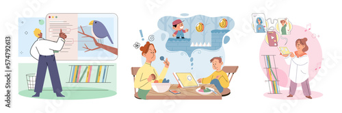 Дизайн целевой страницы европейского завтрака, набор шаблонов баннеров веб-сайта, плоская векторная иллюстрация. Женщина пьет кофе с круассаном и миндальным печеньем на завтрак. Традиционное французское утреннее блюдо.