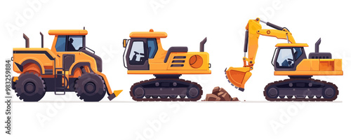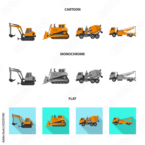 Экскаватор и самосвал, работающие на угольной шахте, плоская векторная иллюстрация. Открытая шахта или карьер, оборудование для добычи полезных ископаемых и транспорт. Процесс добычи и транспортировки угля.