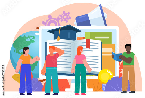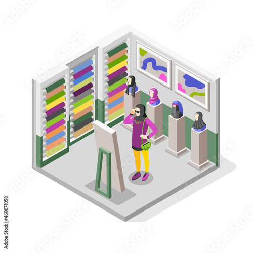 Выставочный стенд торговой выставки, плоская векторная изометрическая иллюстрация. Торговая ярмарка, место проведения рекламного мероприятия с участием промоутера и покупателей. Выставочный стенд. Демонстрационный стенд с витриной прилавка.