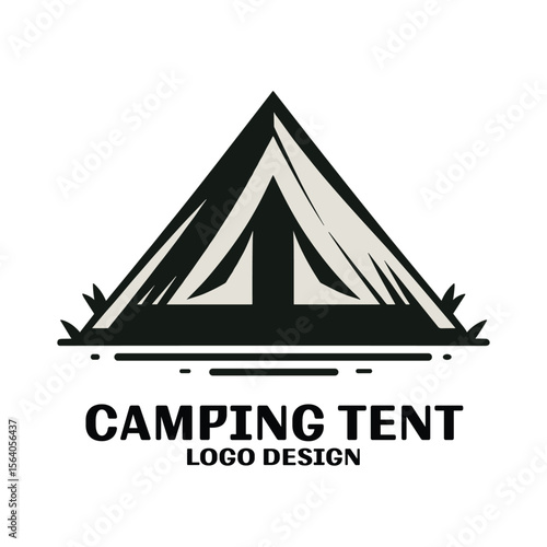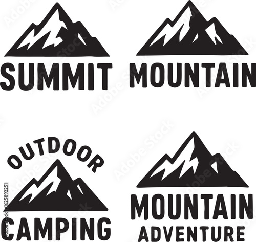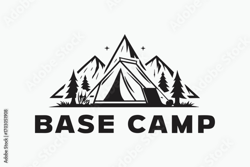Винтажная этикетка с надписью "Экстремальные приключения и кемпинг в горном лесу". Графическая наклейка с эмблемой лагеря на белом фоне. Туристические экспедиции и альпинизм