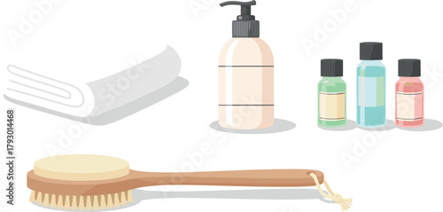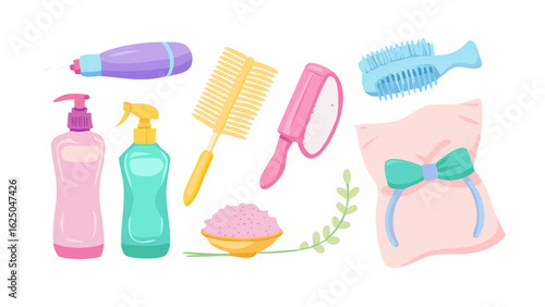 Векторная иллюстрация принадлежностей для массажа лица. Различные нефритовые скребки для гуаши, валики и эфирное масло во флаконе для косметических услуг красоты