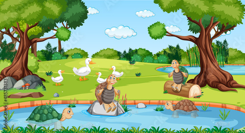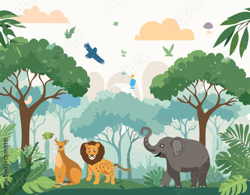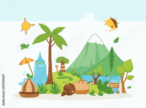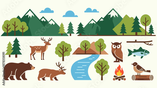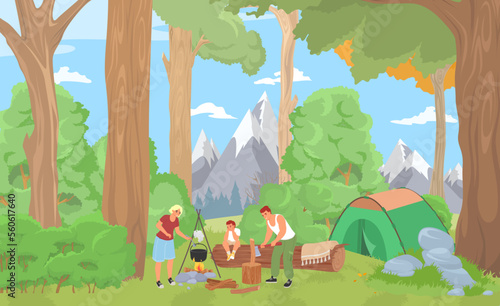 Семейный лагерь в лесу векторная иллюстрация. Мультяшные люди отдыхают в горах во время летних каникул. Сцена пикника на открытом воздухе. Отдых родителей и детей у костра. Ландшафт пешего туризма