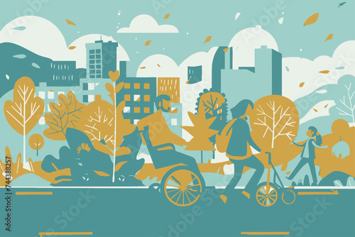 Векторная иллюстрация семейных персонажей, идущих вместе по улице. Пожилая пара, отец, мать и их сын, держащиеся за руки. Дизайн в плоском стиле.