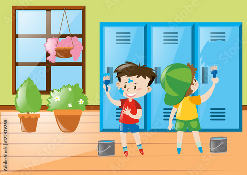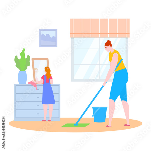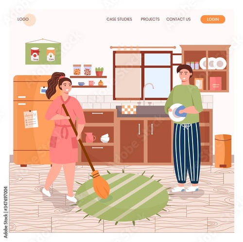 Семья убирает кухню и вместе моет посуду. Иллюстрация концепции уборки дома. Векторный шаблон дизайна веб-сайта. Иллюстрация сайта целевой страницы.