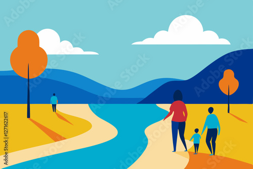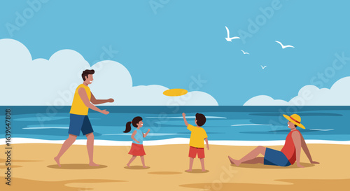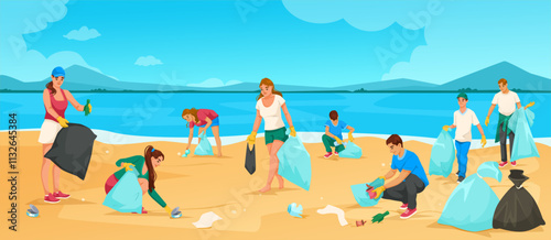 Семья собирает мусор в мешки на пляже. Векторная иллюстрация концепции чистой окружающей среды для людей. Волонтеры убирают морское побережье.