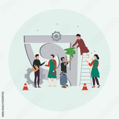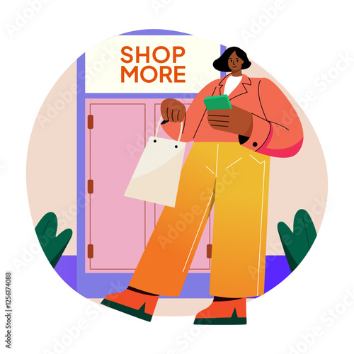 Семейная пара делает покупки в модном бутике, плоская векторная иллюстрация. Счастливая женщина, наслаждающаяся покупками. Мужчина, несущий кучу сумок и подарочную коробку. Жена и муж в магазине женской одежды, торговый центр.