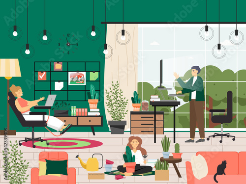 Семейная пара, работающая в домашнем офисе векторная иллюстрация. Мать и отец-фрилансеры, работающие не по найму, используют компьютер или ноутбук, технологию виртуальной реальности на удобном домашнем рабочем месте