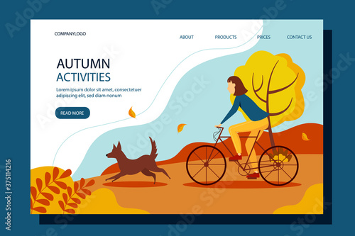 Шаблон веб-сайта велосипедной целевой страницы. Векторная иллюстрация пары, катающейся на велосипедах в парке. Летние развлечения, концепция семейного отдыха.