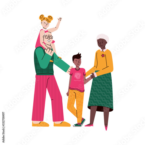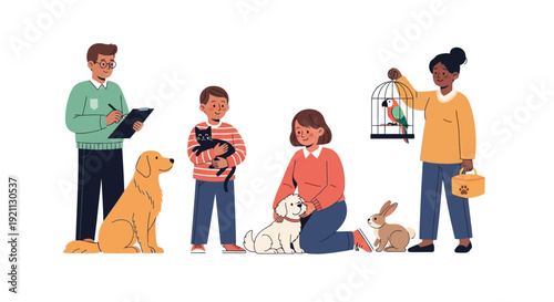 Набор сцен празднования семейной Пасхи, плоская векторная изолированная иллюстрация. Счастливые бабушки и дедушки, родители и дети с кроликом, украшенные пасхальными яйцами, куличом, корзинкой и киской из ивовых веток. Игра "Охота за яйцами".