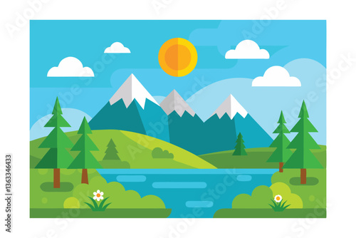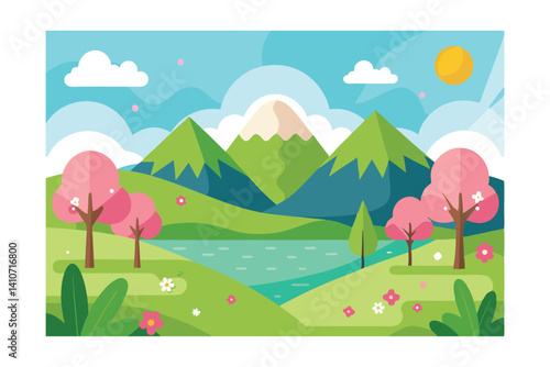 Счастливая семья с рюкзаками, едущая на велосипедах, векторная иллюстрация в стиле бумажного искусства. Семейное эко-путешествие на велосипеде, приключения на свежем воздухе, шаблон плаката для велосипедного туризма.
