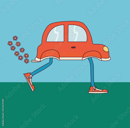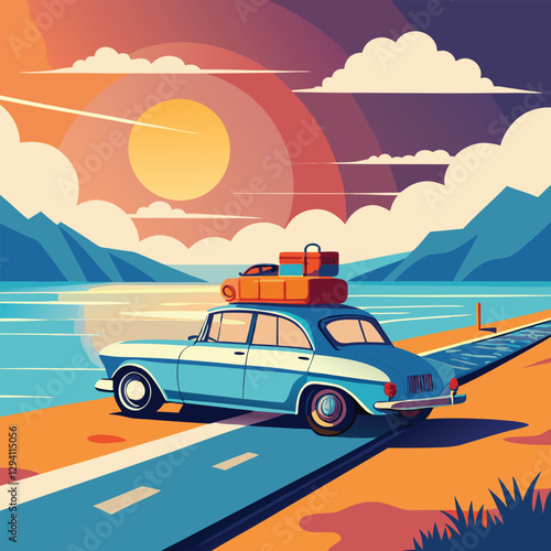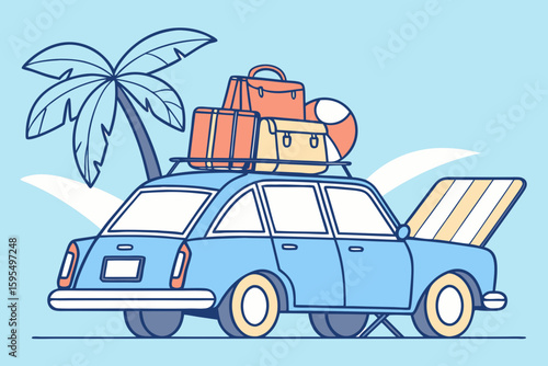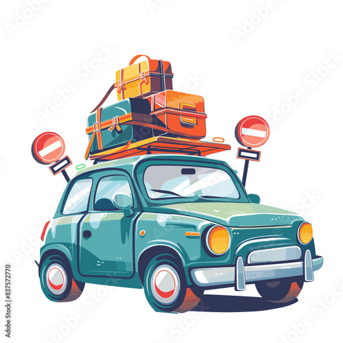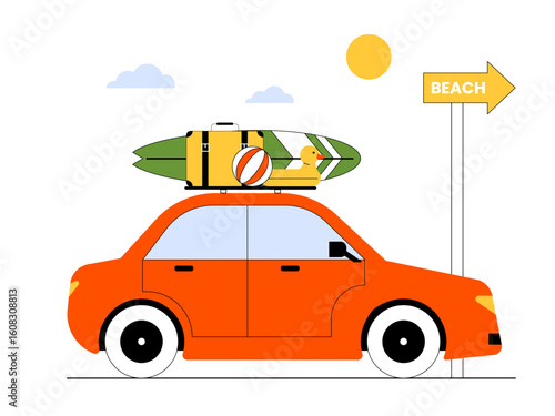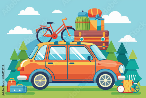 Семья собирается в отпуск на машине. Векторная иллюстрация концепции путешествия в мультяшном стиле.