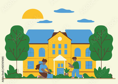 Семейный дом для отдыха на свежем воздухе на заднем дворе, плоская векторная иллюстрация. Бабушки и дедушки, родители с детьми на вечеринке с барбекю или пикнике. Счастливые семейные выходные, летнее времяпрепровождение на свежем воздухе.