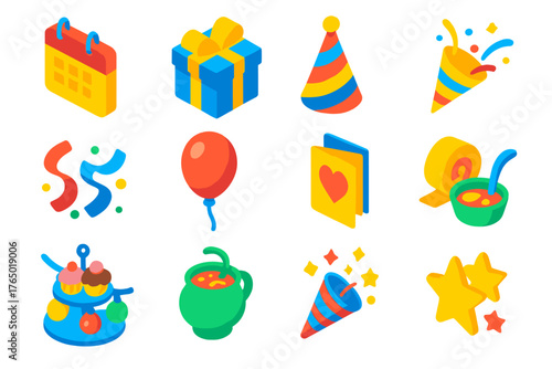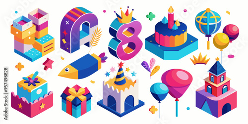 Семейный досуг изометрический набор значков, плоская векторная изолированная иллюстрация. Отец, мать и дети устраивают пикник на природе, играют с собакой в парке, вместе убирают дом. Семейный образ жизни.