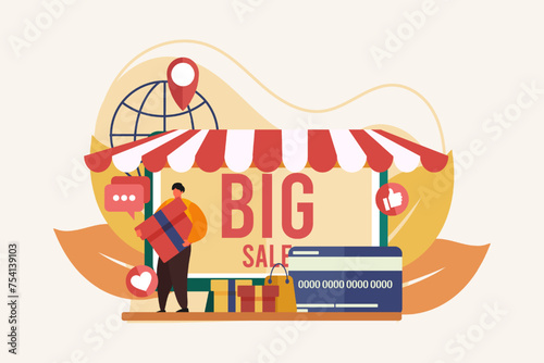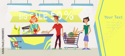 Векторная иллюстрация отца, матери и дочери, делающих покупки в продуктовом магазине или супермаркете. Семья покупает концептуальный элемент дизайна в плоском стиле.