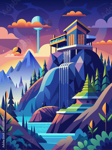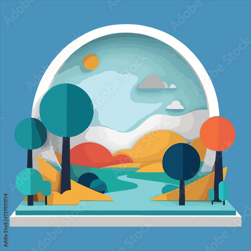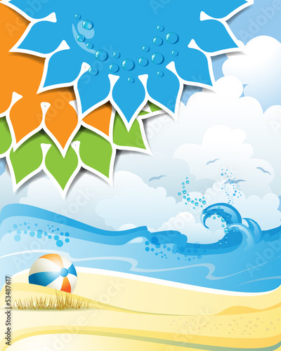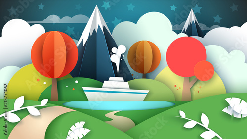 Векторный многослойный вырезанный из бумаги стиль океанских волн и семья с доской для серфинга. Летние каникулы, серфинг, водные развлечения на пляже, шаблон баннера плаката о семейных путешествиях.