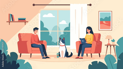Семья с ребенком покупают рыбу в аквариуме в зоомагазине концепция векторной иллюстрации. Интерьер зоомагазина с аквариумом и попугаем в клетке.