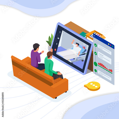 Футбольные фанаты смотрят трансляцию футбольного матча по телевизору, поддерживая любимую команду из дома, плоская векторная изометрическая иллюстрация. Прямая трансляция футбола на телеканале.