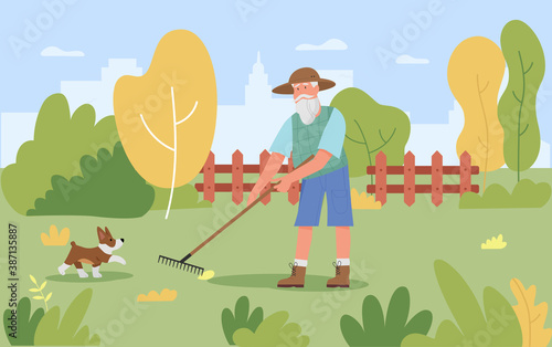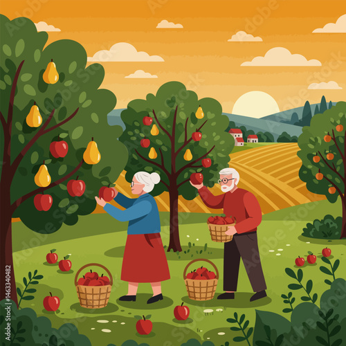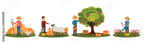 Набор векторных сцен фермерской жизни. Работник сада или сельского хозяйства, собирающий фрукты, выращивающий кукурузу, поливающий рассаду, работающий со скотом на скотном дворе иллюстрация