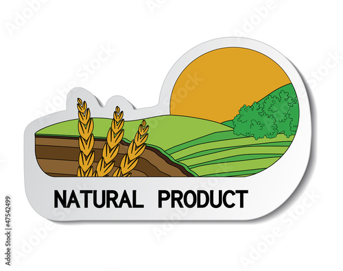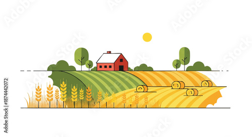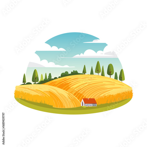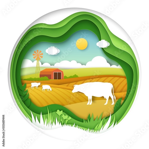 Векторный логотип фермы. Ранчо с органическим полем. Сельский пейзаж с трактором, мельницей и холмами ячменя или пшеницы. Фермерский дом в сельской местности. Стиль вырезания из бумаги