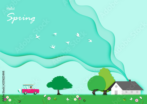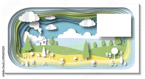 Ферма с коровой, вырезанная из бумаги в векторе искусства оригами. Молоко и молочное производство, концепция сельского хозяйства. Зеленое абстрактное поле на фоне экологической страны и домашнего скота